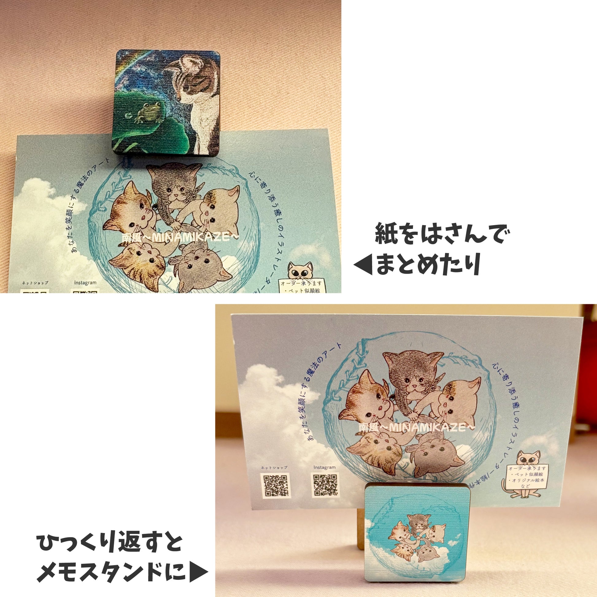 ・プラスチックのクリップに、木製の板を付けています。両面テープで貼ってあるため、強く引っ張ると剥がれてしまいます。お取り扱いにはご注意ください。